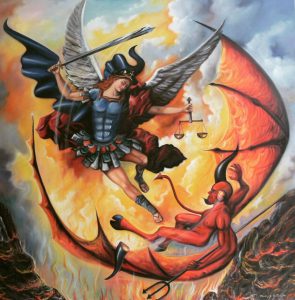 El Arcángel San Miguel embiste con el poder de su espada y escudo a Satanás y lo expulsa de los cielos, es tan acorazado su escudo y tan impenetrable que no se derrumba con ver el poder de los ángeles malignos, pues su mística es mayor y en nombre de Cristo les vence una y otra vez.